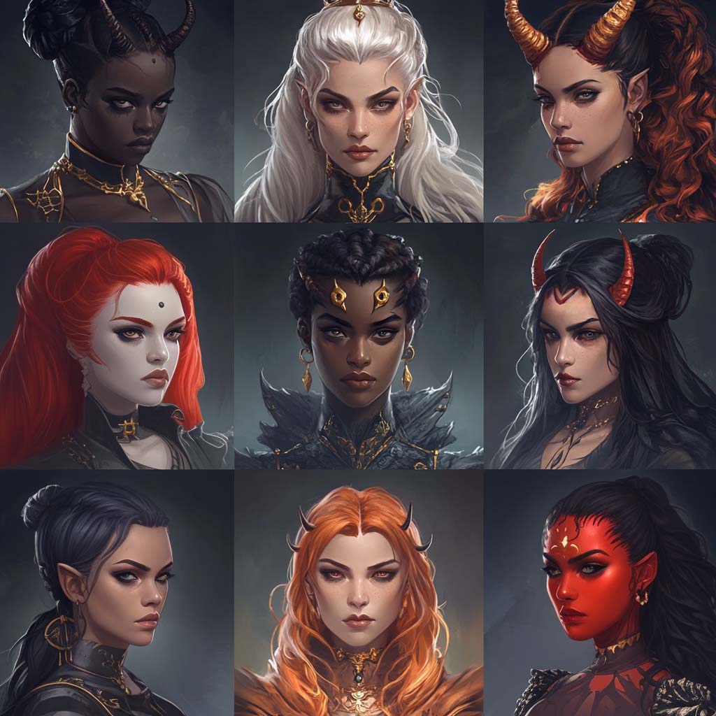 ***Note 3: I'd actually like to find a reasonable alternative to AI art for this project, but the numbers are daunting. The portrait library has nine portraits, in male and female gender variants, for each of eighteen backgrounds. That's 324 somewhat Tinny-Dungeon-style-consistent pieces of art in 36 separate 1024 pixel square files, each of which is a 3x3 grid of nine portraits. An added wrinkle is that I require skin-tone diversity — not all drow elves can be dark skinned, not all halflings can be light-skinned, etc. Here's an example image.